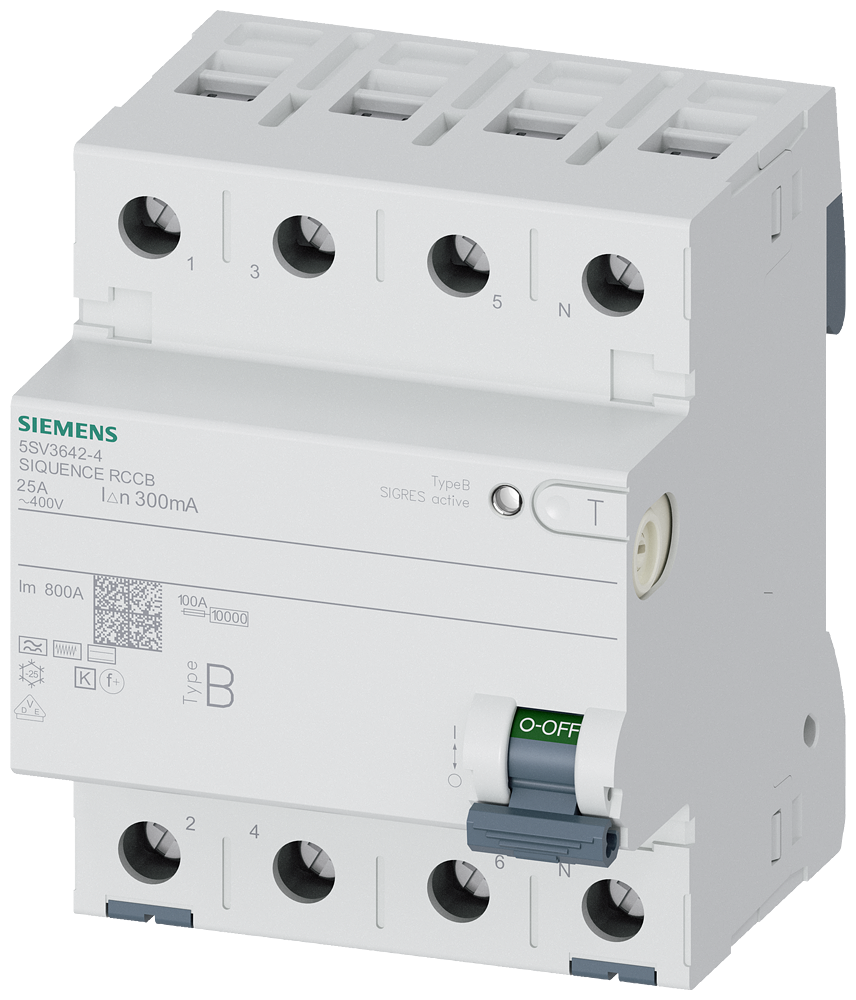 FI-Schutzschalter 4-polig Typ B 25A 300 mA – Siemens 5SV3642-4Hochwertiger Fehlerstromschutzschalter mit 300 mA Auslösestrom und 25 A Nennstrom, kurzzeitverzögert (Typ B). Für anspruchsvolle Umgebungen geeignet dank SIGRES-Ausführung. Erkennt glatte Gleichfehlerströme sowie Mischfrequenzströme – ideal für PV-Anlagen, Frequenzumrichter oder Ladeeinrichtungen.