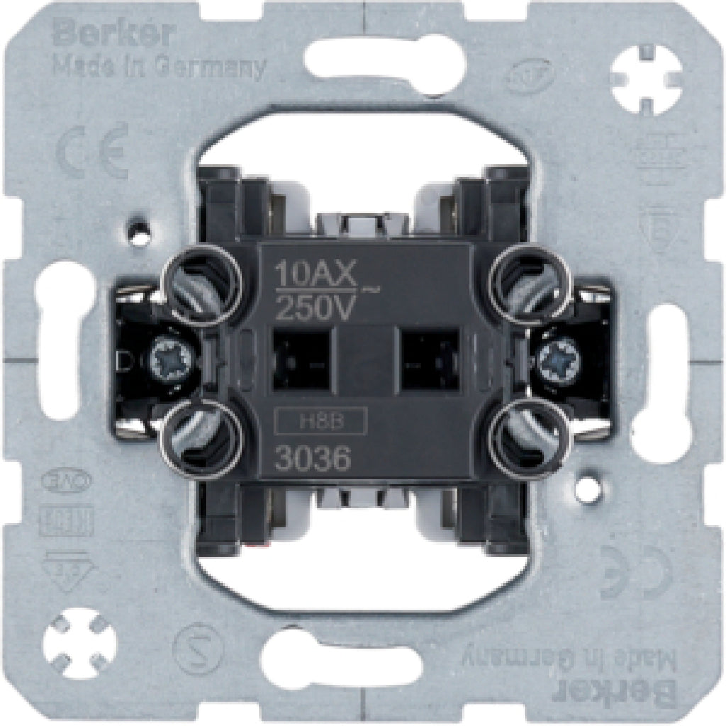 3036 MODUL 2 WECHSELSCHALTER – Wechselschalter-Einsatz (10AX, 250V~) von Berker zur Unterputzmontage. Mit Steckklemmen und beleuchtbar durch Glimm- oder Glühlampenaggregat über N-Klemme. Für Licht- und Kontrollschaltungen. Beleuchtung optional gemäß Arbeitsstättenverordnung.