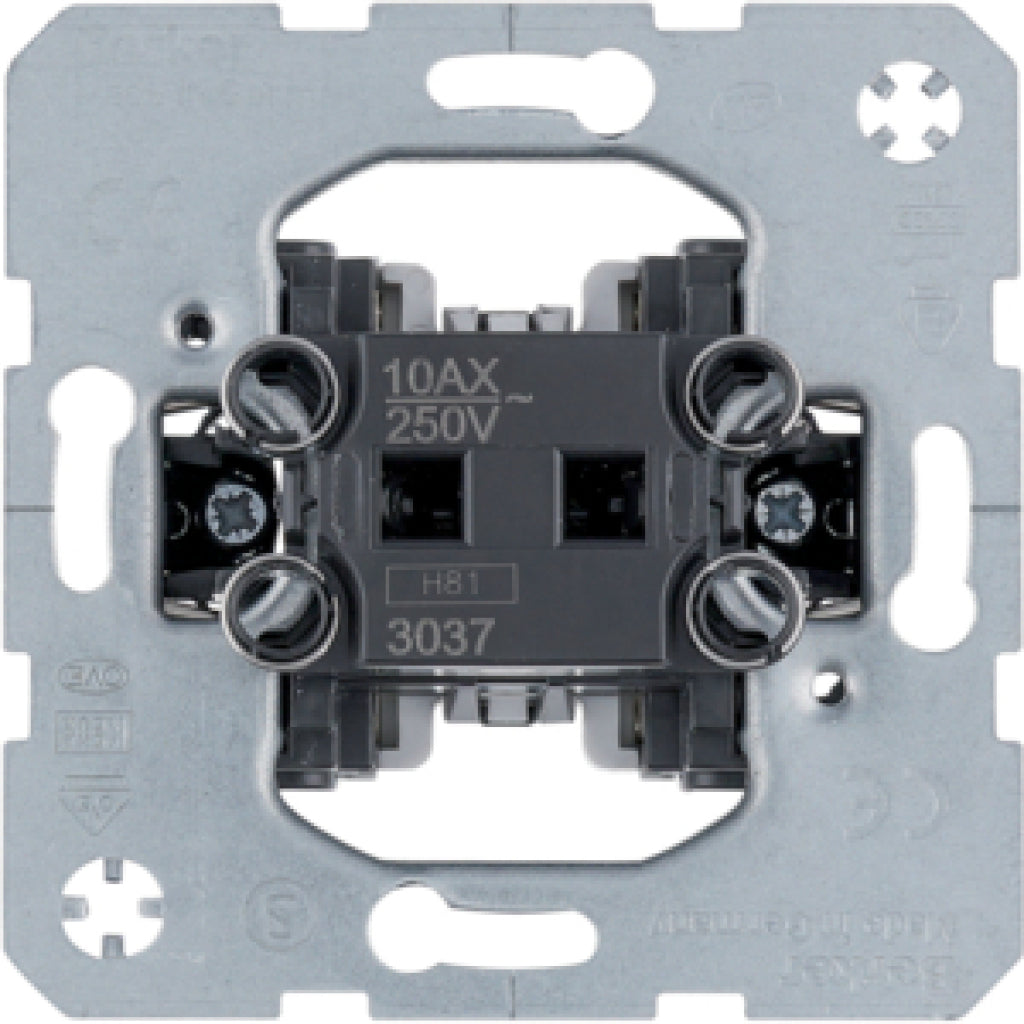 3037 MODUL 2 KREUZSCHALTER – Kreuzschalter-Einsatz mit Steckklemmen und integrierter N-Klemme zur optionalen Beleuchtung (Kontroll- oder Orientierungslicht) mit Glimm- oder Glühlampen. Unterputz-Montage. Geeignet für Kreuzschaltungen. Bemessung: 10 A / 250 V. Schutzart IP20.