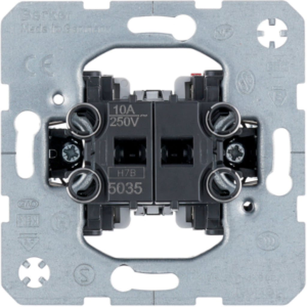 Serientaster 2fach (5035) mit gemeinsamer EingangsklemmeSerientaster mit zwei Schließer-Kontakten, geeignet für Unterputzmontage. Geteilte Wippe, Anschluss über Steckklemme (quickconnect). Kompatibel mit den Schalterprogrammen Berker K.x, Q.x, R.x sowie S.x/B.x.