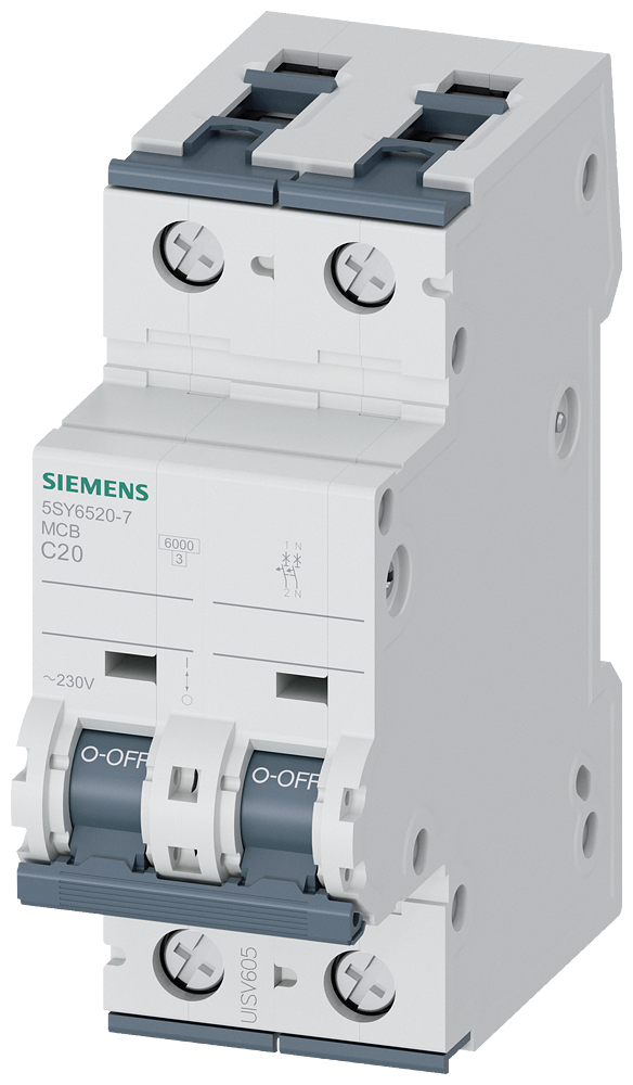 Leitungsschutzschalter 1P+N, 20A, Typ C, 6kA – Siemens SENTRON 5SY6520-7Zuverlässiger Leitungsschutzschalter für 230 V AC-Anlagen. Mit C-Charakteristik für Standard- und leicht induktive Lasten, Schaltvermögen 6 kA nach EN 60898. 2-polig (1+N), Montage auf DIN-Schiene (2 TE, Tiefe 70 mm). Ideal für Wohn- und Zweckgebäude. Halogenfreies Gehäuse, plombierbar, mit optionalem Zubehör wie Sammelschienen kombinierbar.