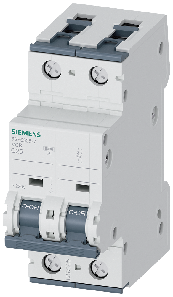 Leitungsschutzschalter 1P+N, 25A, Typ C, 6kA – Siemens SENTRON 5SY6525-7Zweipoliger Leitungsschutzschalter mit 25 A Bemessungsstrom und C-Charakteristik, ideal für stromstärkere oder induktive Verbraucher. 6 kA Abschaltvermögen gemäß EN 60898. 1+N-polige Ausführung für 230 V AC, geeignet für DIN-Hutschienenmontage, Breite 2 TE. Halogenfrei, plombierbar und mit umfangreichem Zubehör kombinierbar.