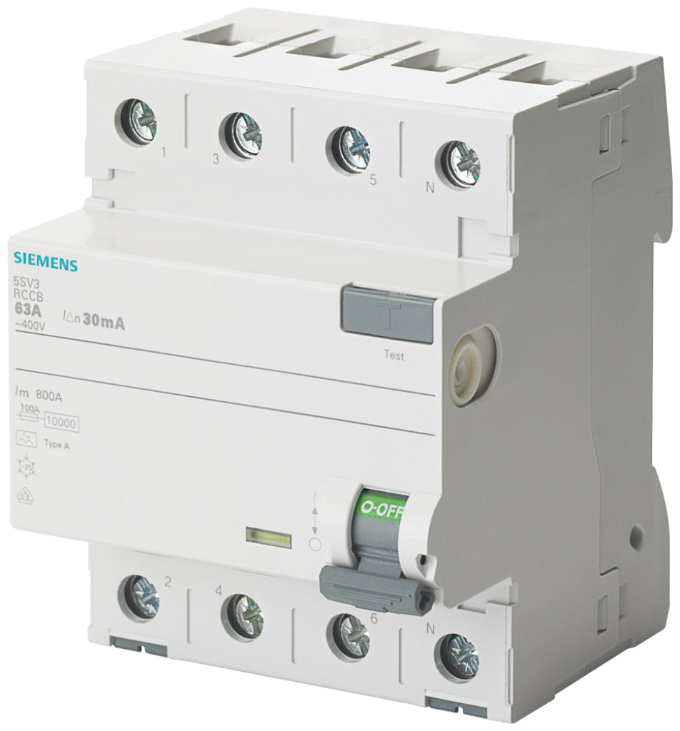 FI-Schutzschalter Siemens 5SV3344-6 4-poliger Fehlerstromschutzschalter vom Typ A mit einem Bemessungsstrom von 40 A und einem Auslösestrom von 30 mA für 400 V AC. Er bietet zuverlässigen Schutz bei direktem und indirektem Berühren elektrischer Anlagen, ideal für allgemeine Anwendungen in Wohn- und Zweckbauten.